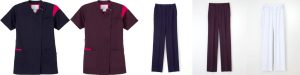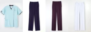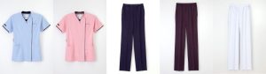 スクラブタイプのユニフォームで、それぞれスクラブ2色(歯科衛生士は1色のみ)、パンツ3色から選ぶことができ、上下の色の組み合わせは自由です。
